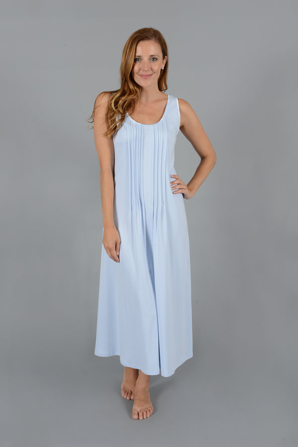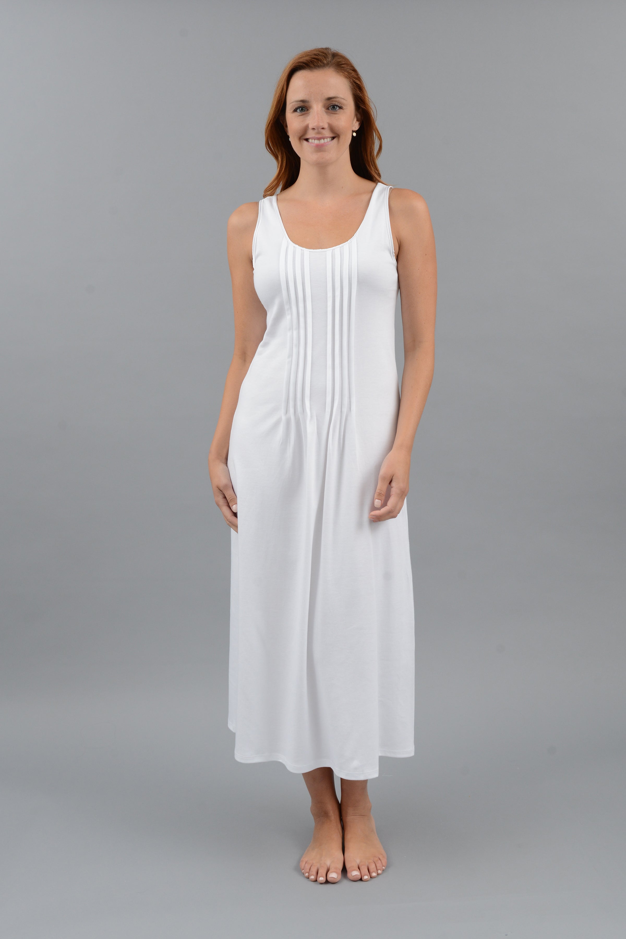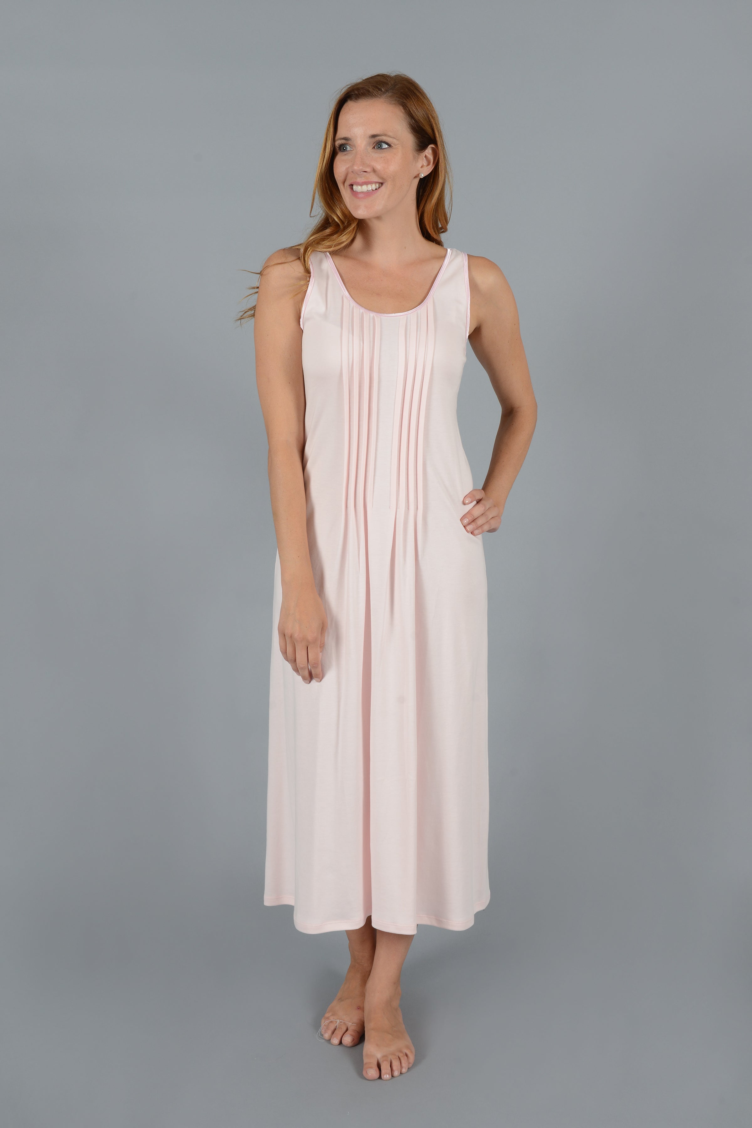 This 100% Pima Cotton pleated long tank nightgown is a great option for someone who wants the freedom of sleeveless pajamas. Elegant and tasteful.