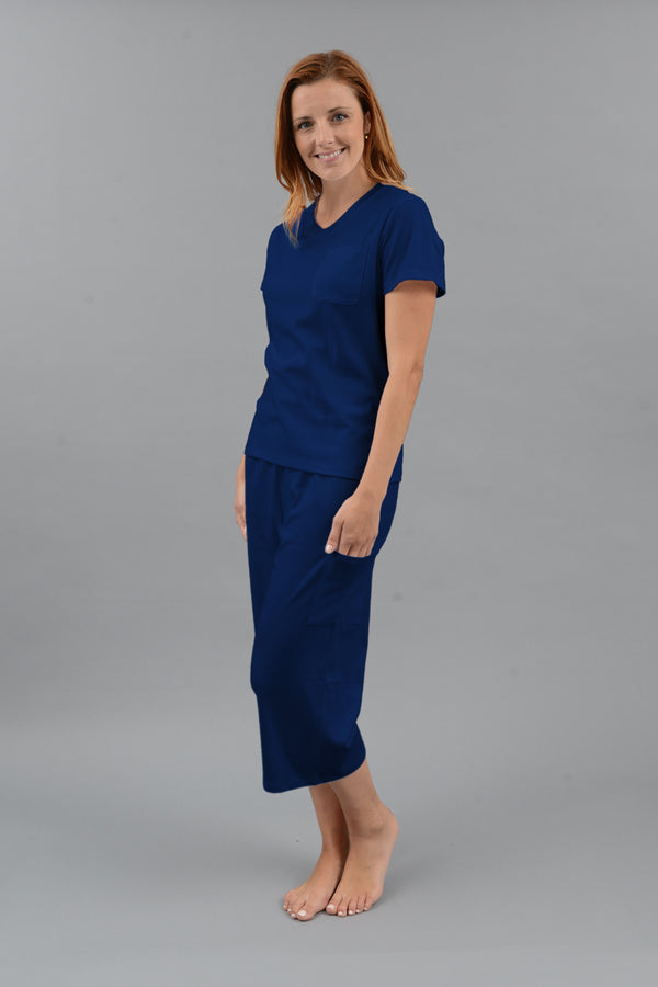 Two-piece Capri pajama set made from 100% Pima cotton, featuring a V-neck top and side pocket on the Capri pants—perfect for holding your cell phone or tissues! and 100 percent pima cotton!