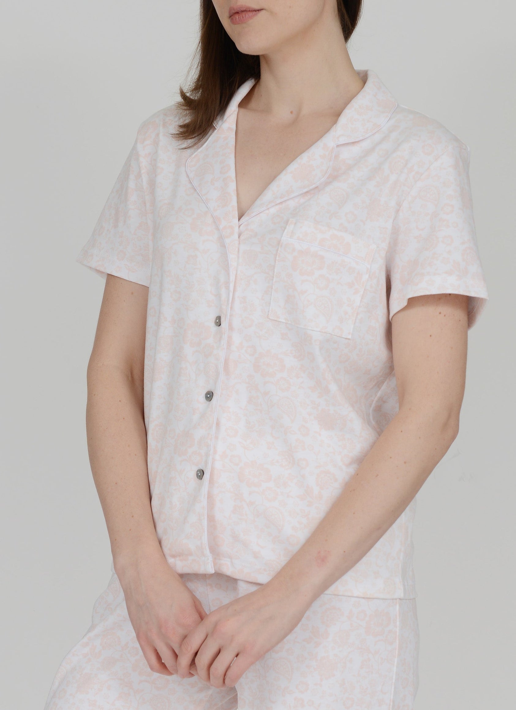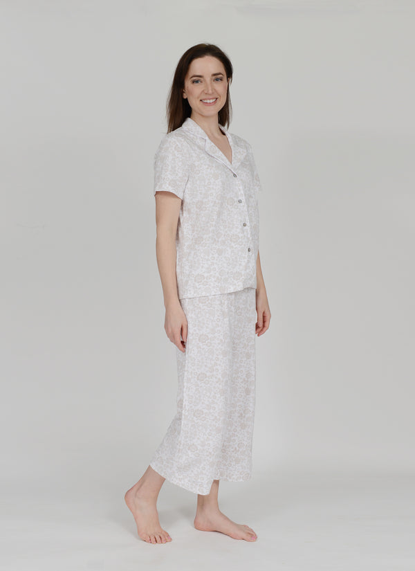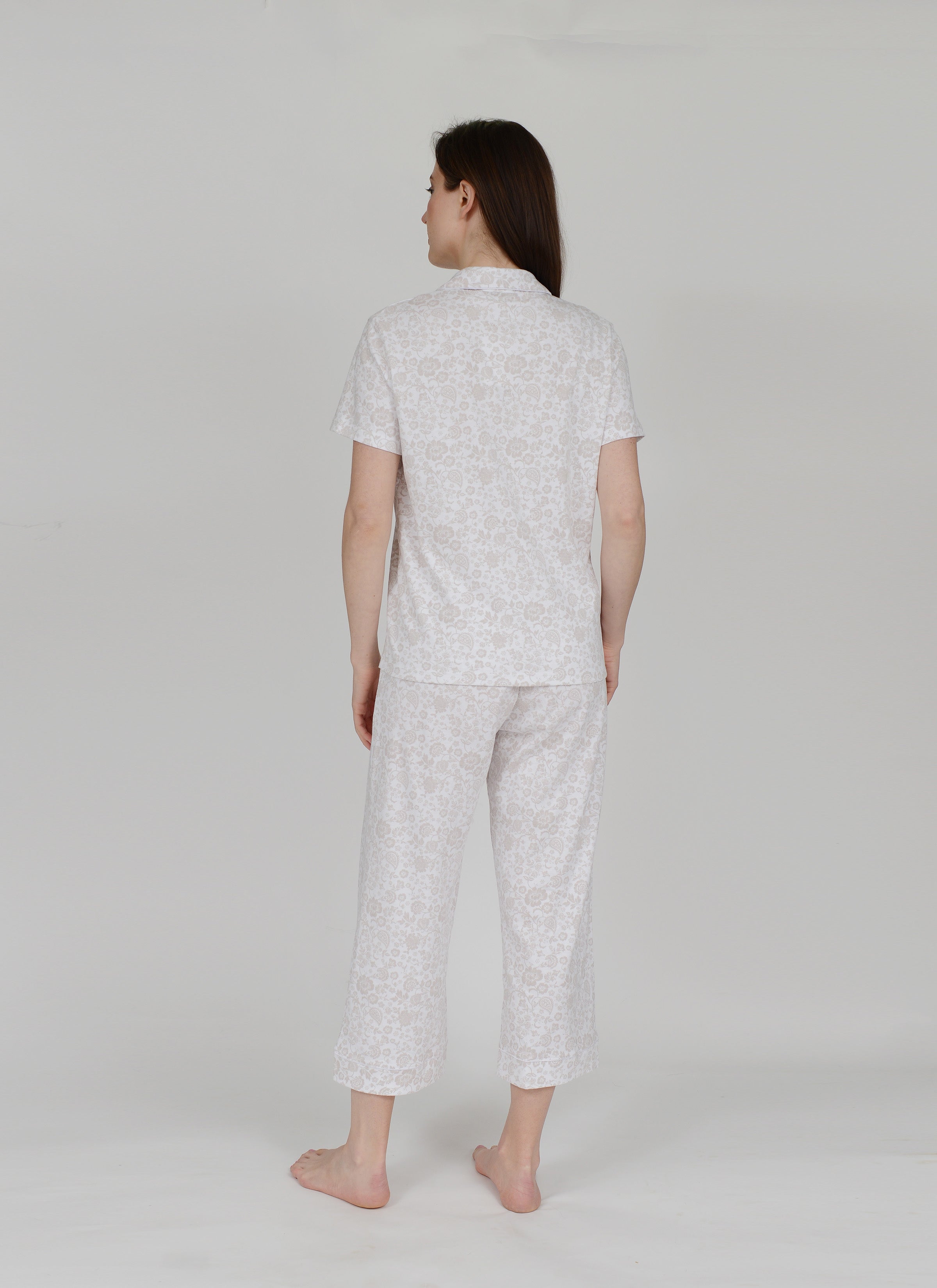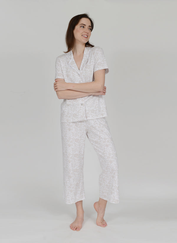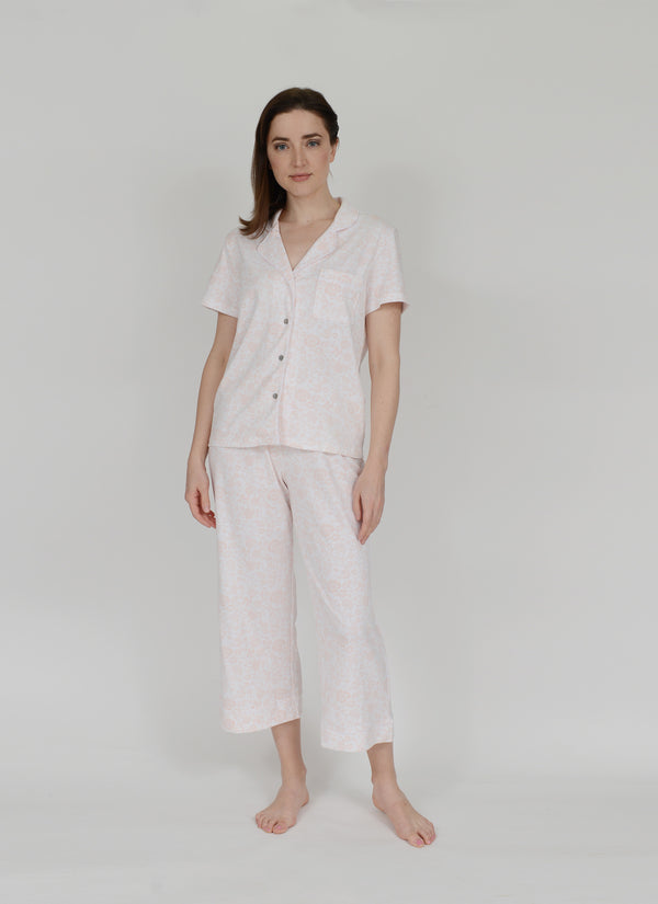 Our favorite classic capri in floral paisley has arrived! The top has a pocket and a double shawl collar. This short-sleeve shirt is perfect for everyday wear around the home or on a trip. The capri-length pants is great for anyone and will never need hemming.