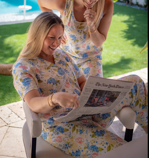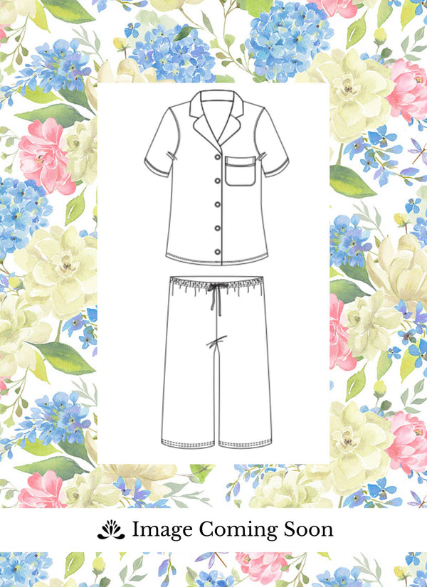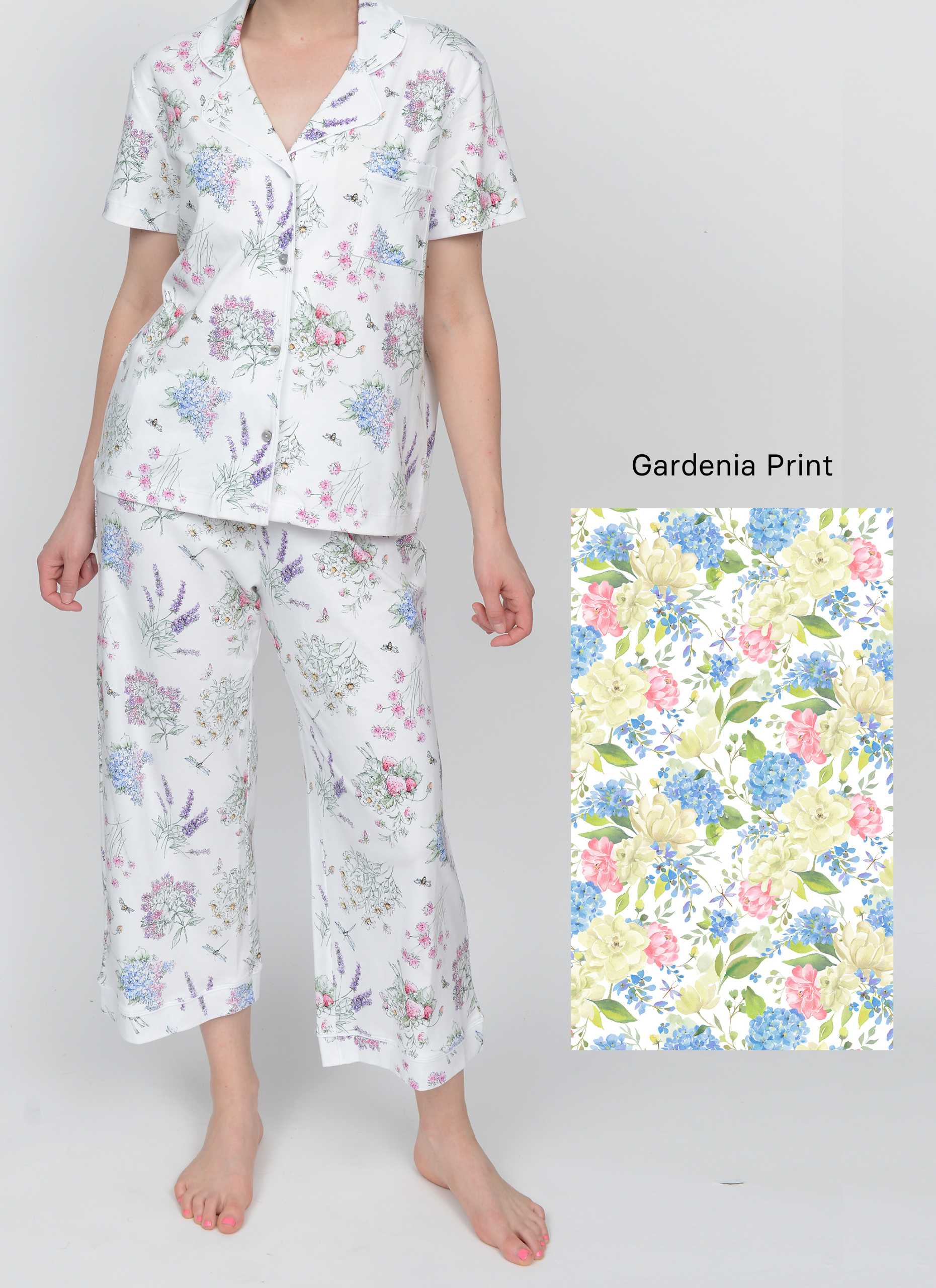Our best bet for Summer in a new gardenia print- whether or not you are travelling or at home- This pima pj is ideal. A lot of customers dont want a long pant so this is a great option. The sleeves are short and it has a button front opening allowing for easy access. It is make from 100 percent pima cotton and comes in size xs thru xl.