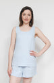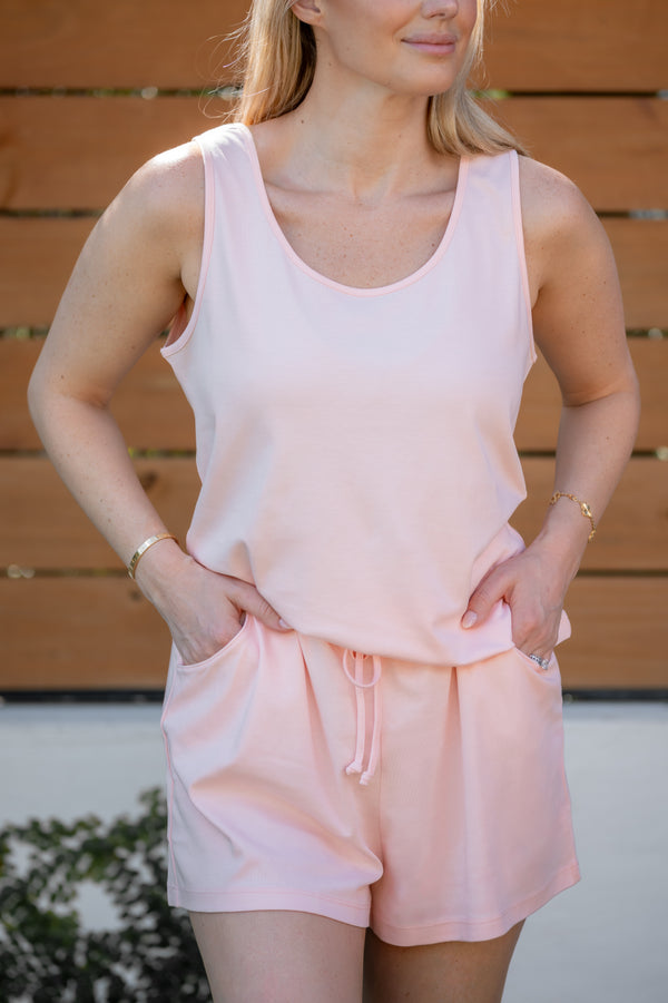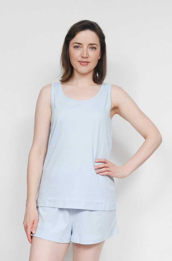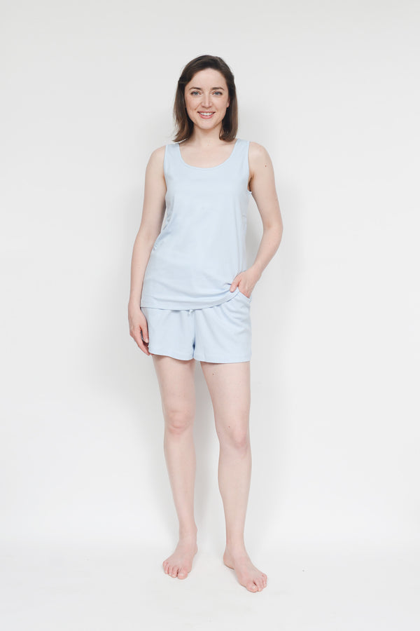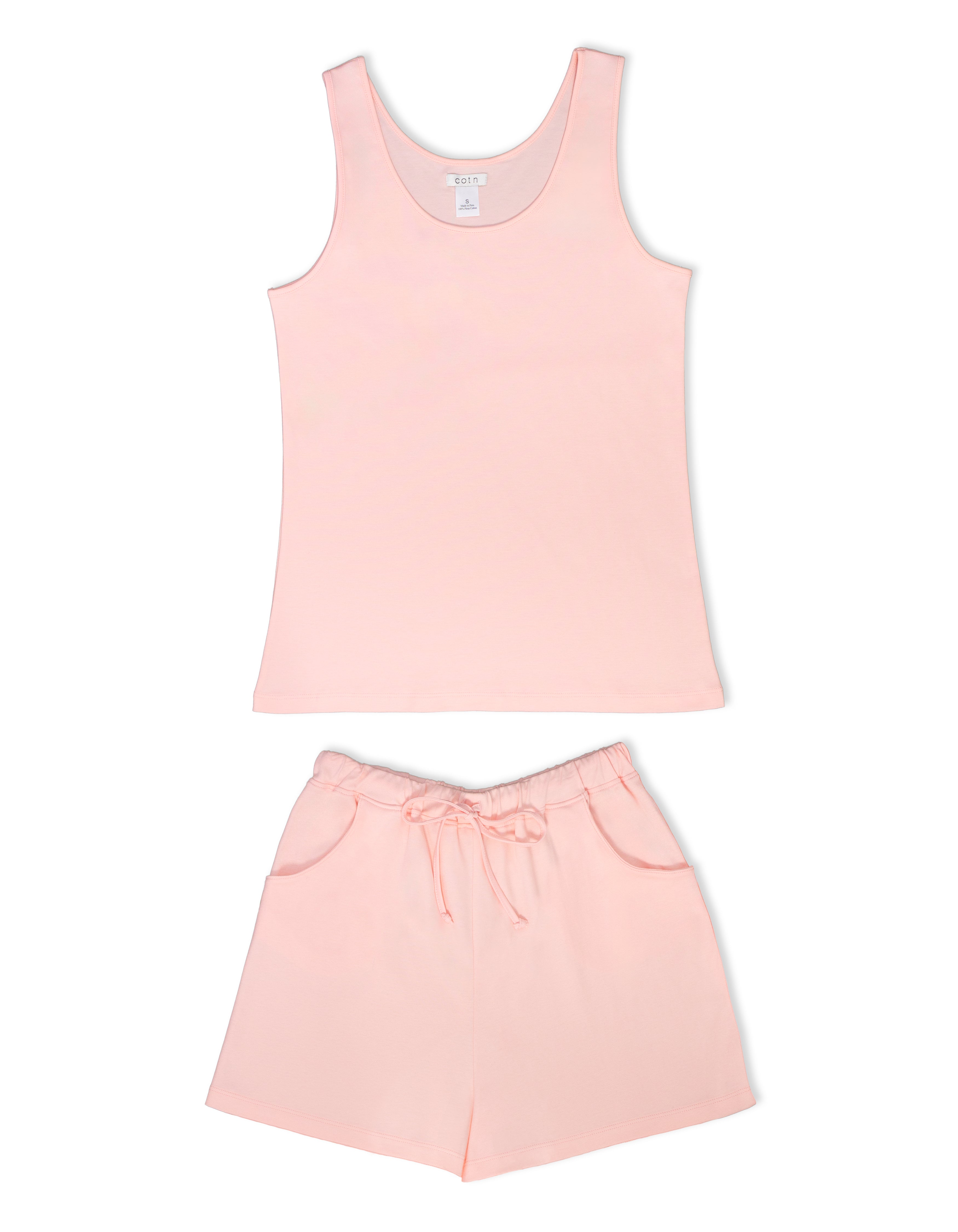 This is a new style added to our classic collection. A tank top with shorts that have an elastic waist and a draw string and two inseam pockets-It is available in two colors, pink and blue. And of course 100 percent pima cotton- Perfect for those warm Summer nights