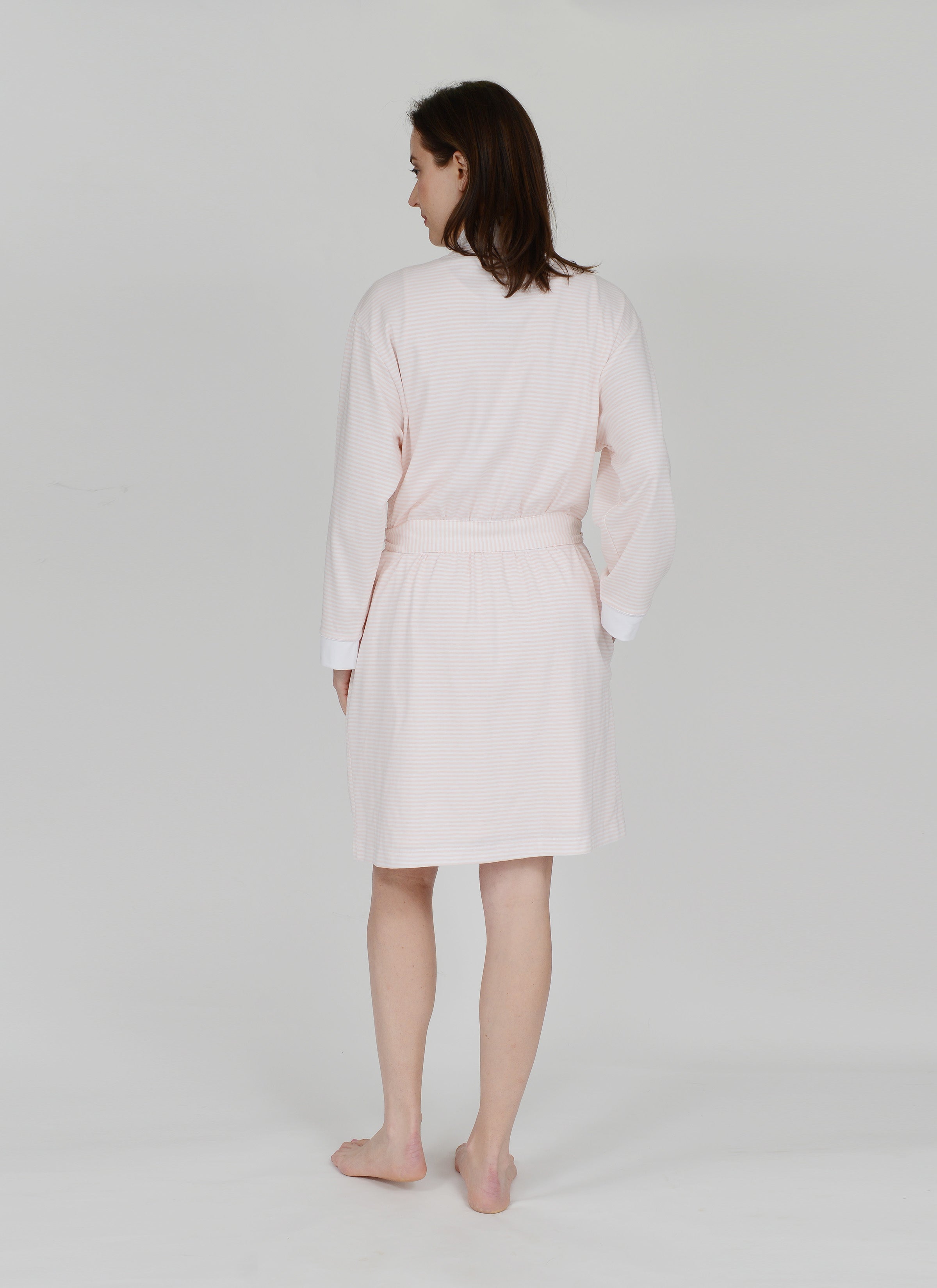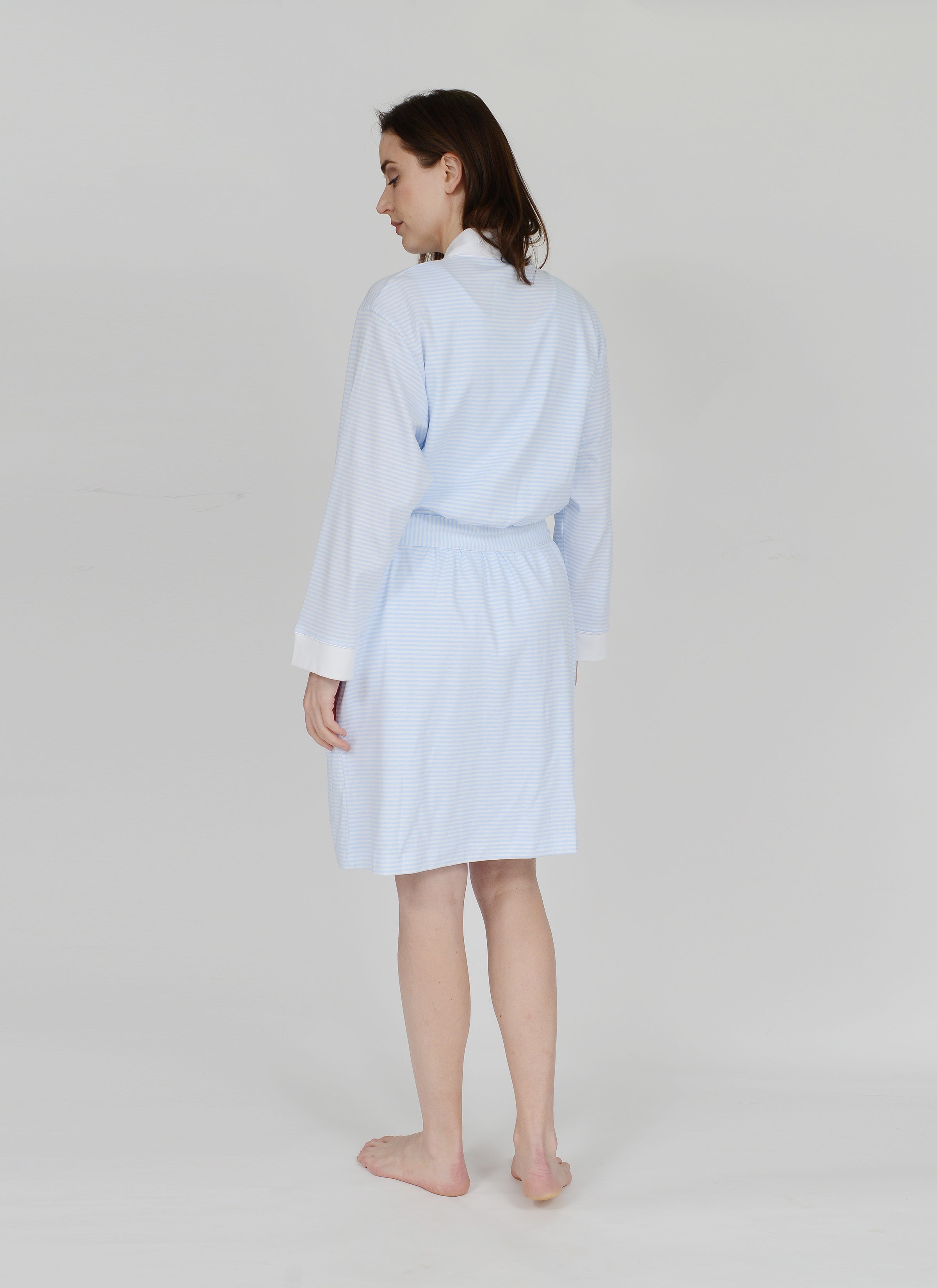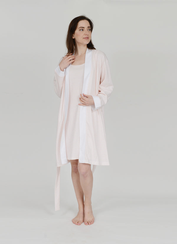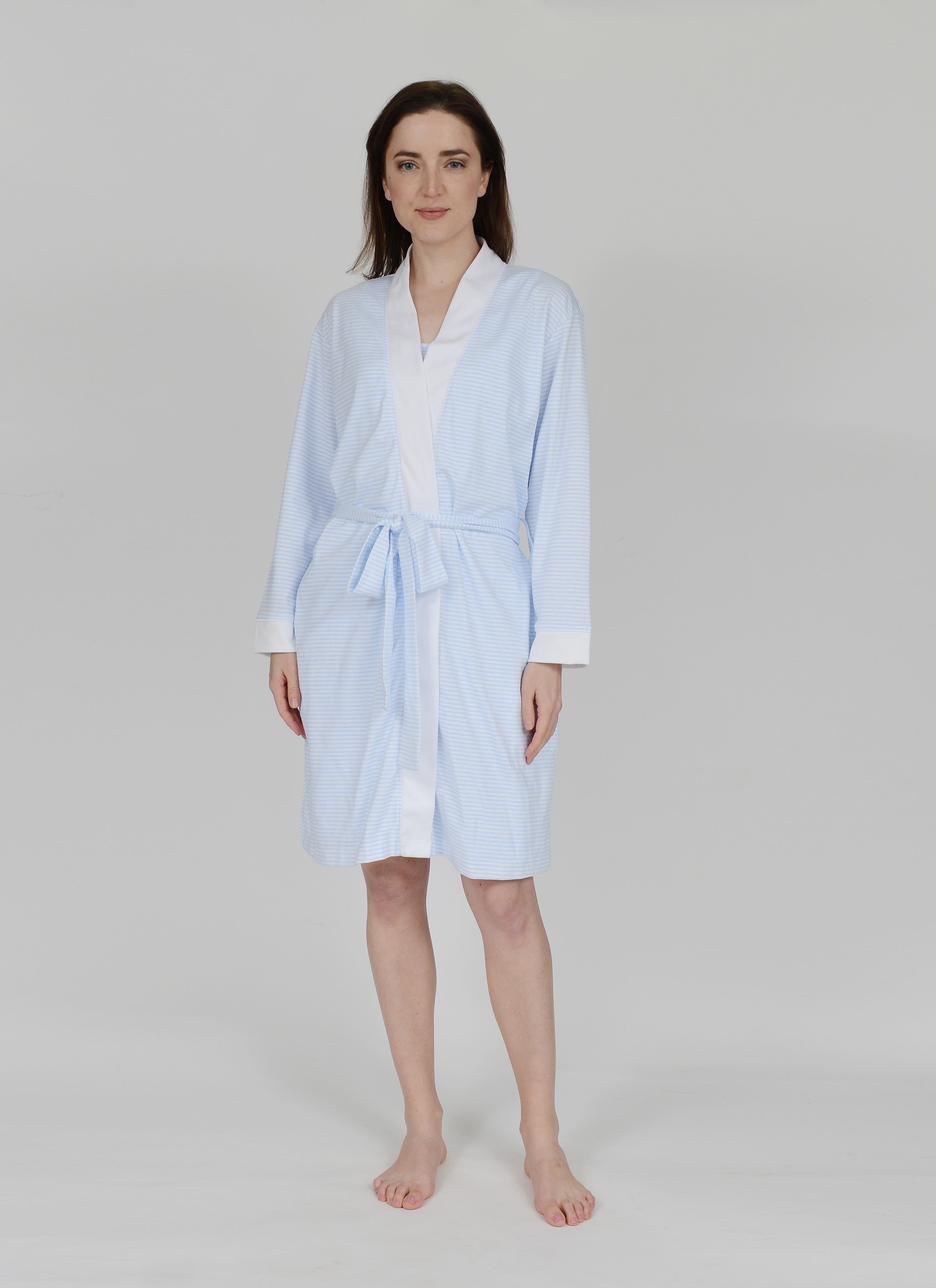 This short Stripe Pima Cotton Robe is the perfect companion to your favorite nightgown or Pj. It pairs perfectly with any of our blue or pink pieces. This robe is lightweight and easily packable, and with the sewn in belt at the back you'll never have to worry about misplacing it. The blue stripe robe is trimmed with white pima cotton accents, and the pink with white pima cotton accents.