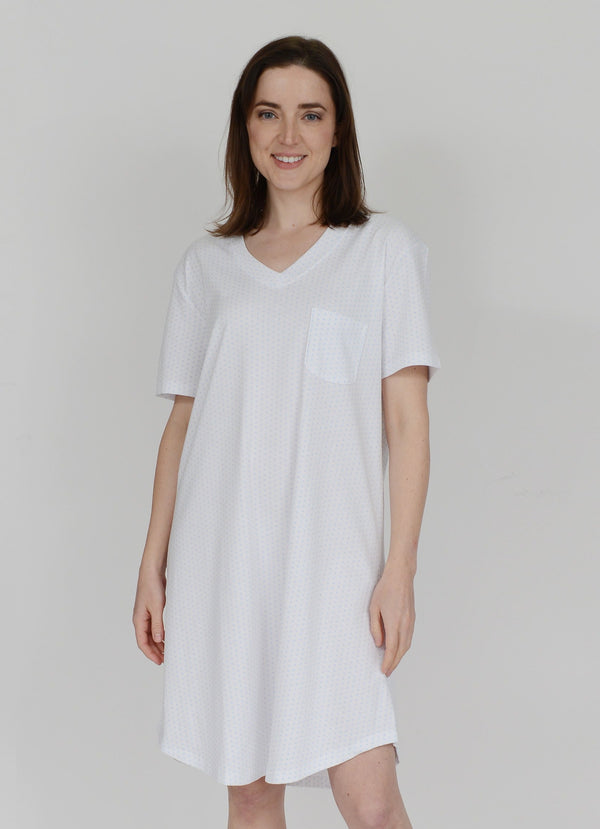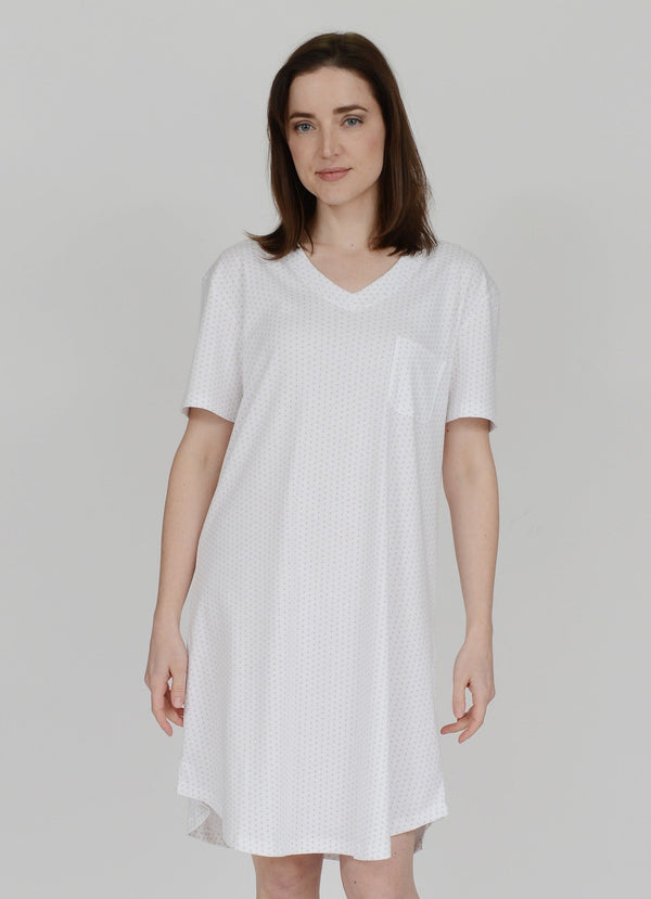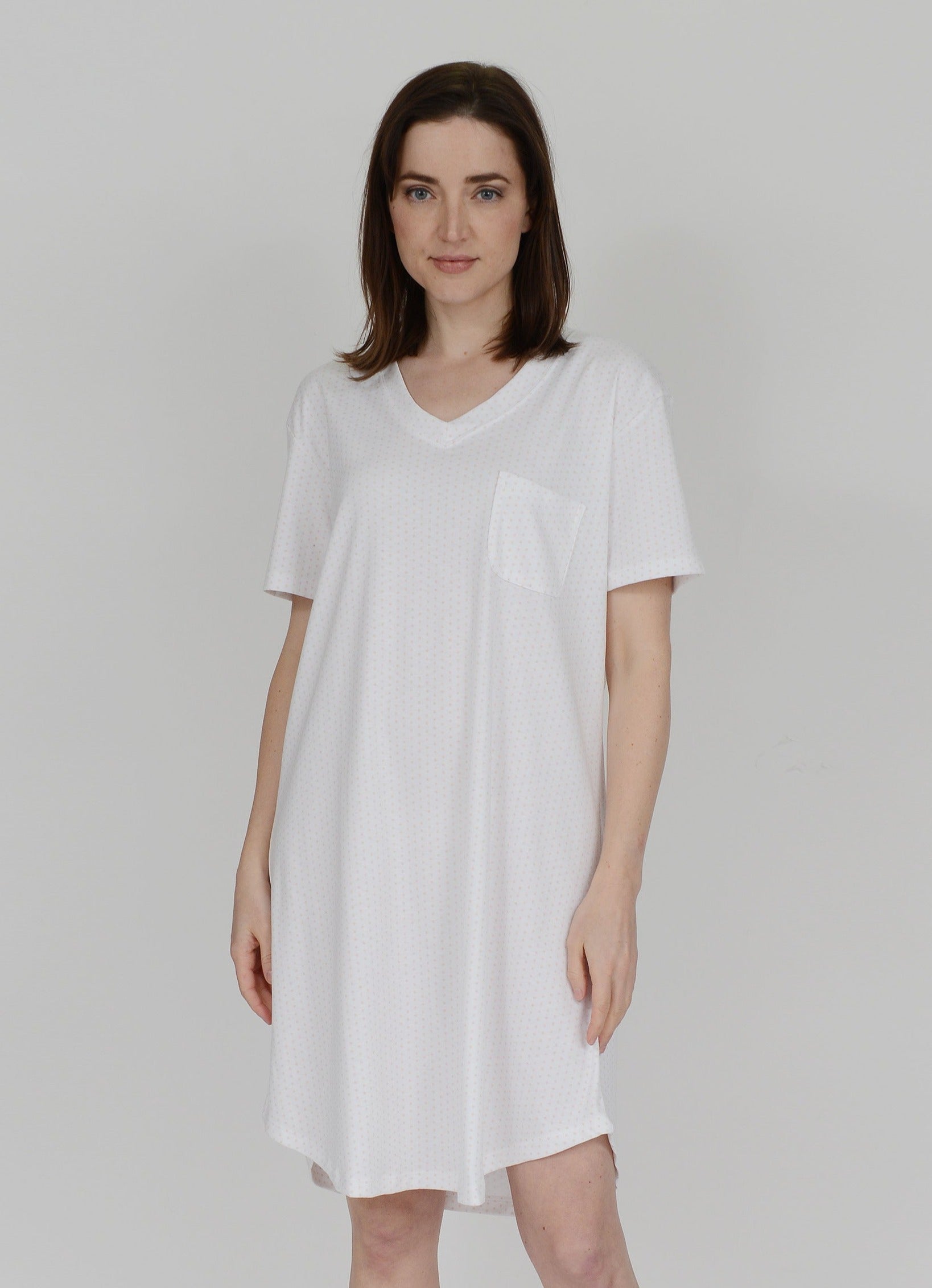 Our Best Seller! This 100% Pima Cotton, V-Neck Nightshirt with short sleeves and a breast pocket will remind you of a comfy oversized Tee. You'll want more than one! This white nightshirt comes with pink, blue, grey, denim, or New Ruby printed all over polka dots.